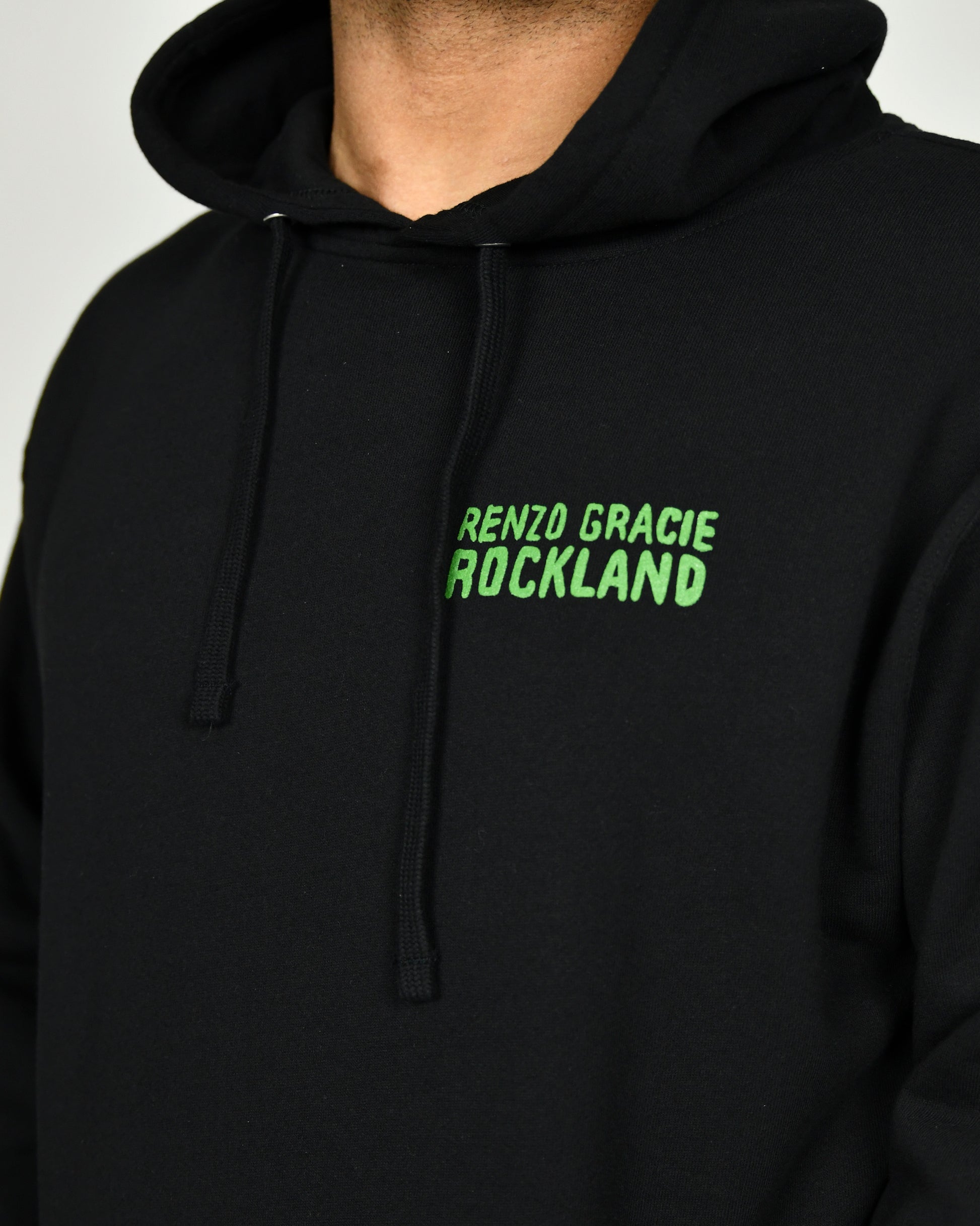 Rep your academy with the Renzo Gracie Rockland hoodie. Features bold "Renzo Gracie Rockland" text on the left chest and a striking green snake graphic on the back. Made for grapplers, worn everywhere.